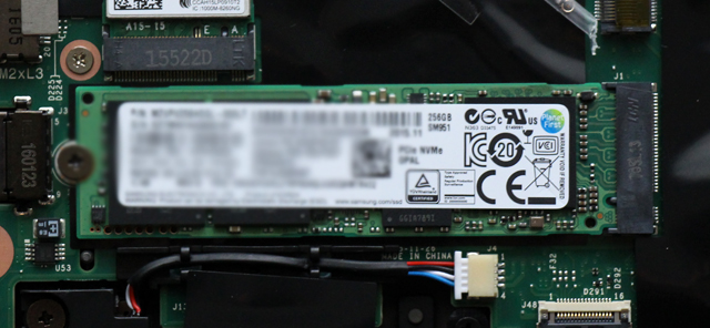こちらはM.2スロットに搭載されたM.2 SSD。 T460sのストレージはこれのみであり、カスタマイズでいくつかのM.2 SSDの中から選択できるようになっています。 最大ではなんと、1TBものNVMe SSDを選択可能です。まあ価格は高いですが、大容量が必要な人向けの選択肢も提供されているというわけです。