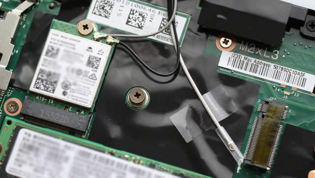 M.2スロットのすぐそばに、無線LANのスロットが並んでいます。 片側には無線LANが搭載されていますが、もう片側は空。 T460sの海外製品ではWWANのモデルも提供されており、WWANで利用するスロットなのでしょう。 もちろん日本向けの製品にはそのようなオプションは提供されていません。